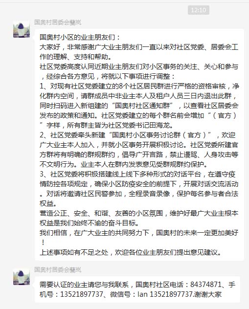 1、对现有社区党委建立的8个社区居民群进行严格的资格审核,净化群内空间,请群成员中非业主本人及租户人员三日内退出此群,同时扫码进入新组建的“国奥村社区通知群”,以查看社区居委会发布的政策和通知。社区党委建立的每个群名前会增加“(官方)”字样,所有群主皆为社区党委书记田海龙。