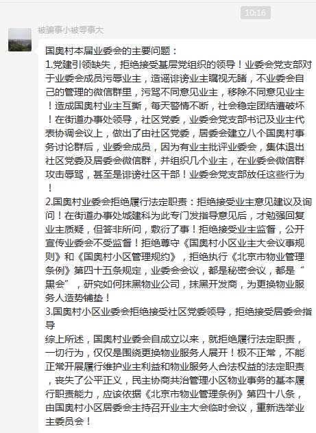 2.国奥村业委会拒绝履行法定职责:拒绝接受业主意见建议及询问!在街道办事处城建科为此专门发指导意见后,才勉强回复业主质疑,但答非所问,敷衍了事!拒绝接受业主监督,公开宣传业委会不受监督!拒绝尊守《国奥村小区业主大会议事规则》和《国奥村小区管理规约》,拒绝执行《北京市物业管理条例》第四十五条规定,业委会会议,都是秘密会议,都是“黒会”,研究如何抹黑物业公司,抹黑开发商,为更换物业服务人造势铺垫!