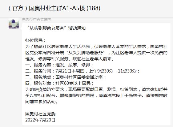 为了提高社区居家老年人生活品质,保障老年人基本的生活需求,国奥村社区党委本周四将开展“从头到脚助老服务”,为社区老年人提供一次免费的理发、修脚等相关服务。欢迎社区老年人前来。