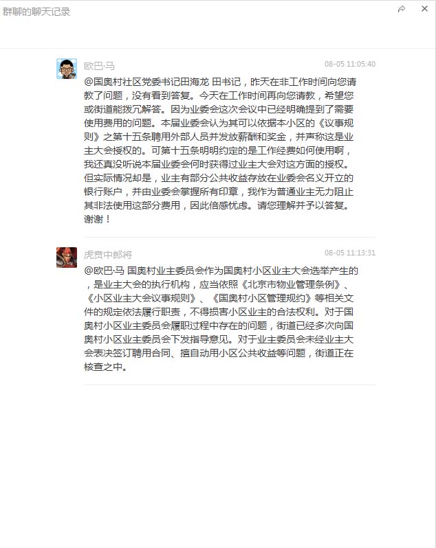 2022年08月05日国奥村社区党委书记田海龙在业主欧巴·马的微信聊天记录