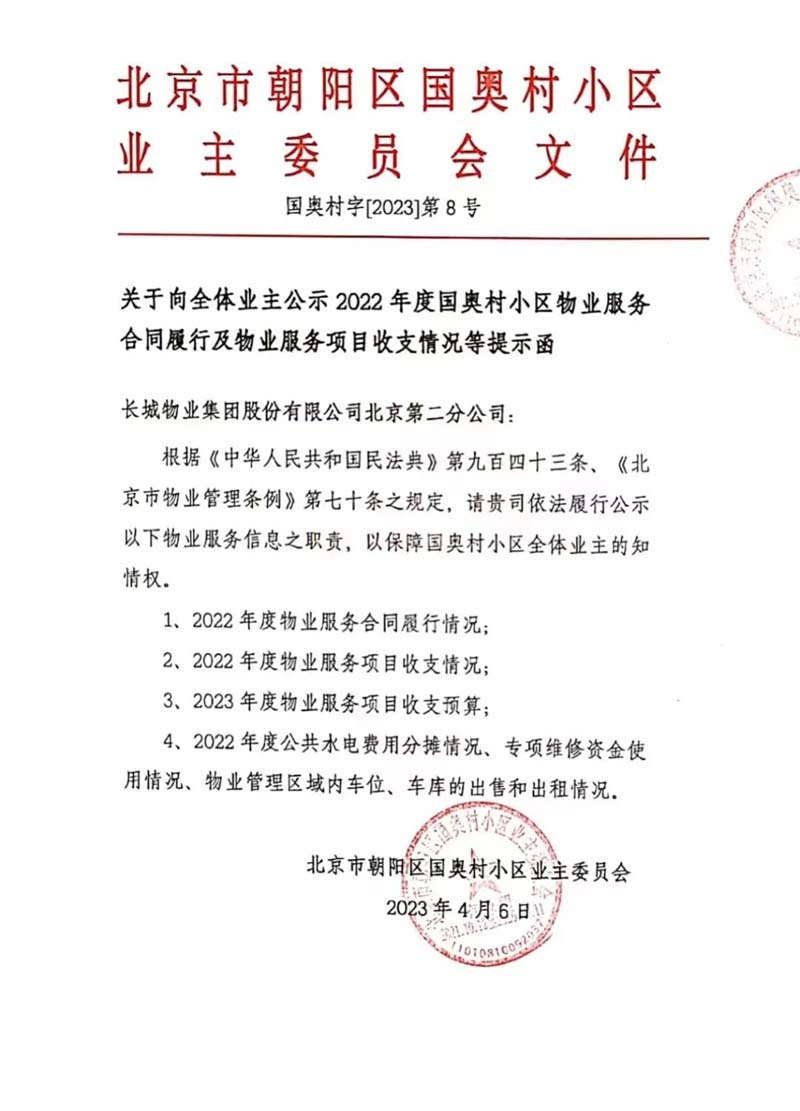 公告联系函长城物业 国奥村字[2023]第08号 (关于向全体业主公示2022年度国奥村小区物业服务合同履行及物业服务项目收支情况等提示函) Posted April 11, 2023April 12, 2023 jinrui 北京国奥村小区业委会 2023-04-08 08:02 发表于北京