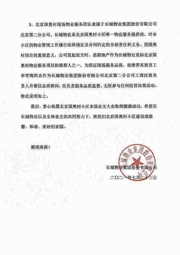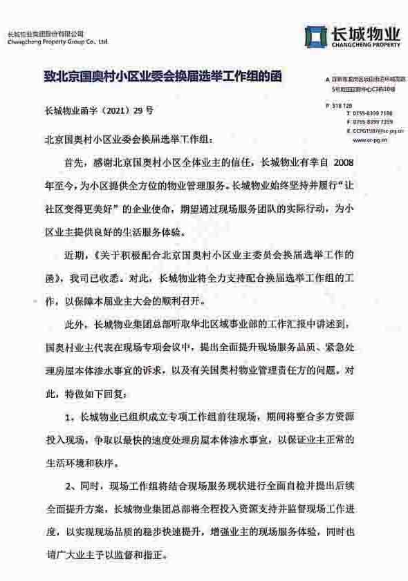 2021年07月23日长城物业总公司致函国奥村业委会换届选举工作组