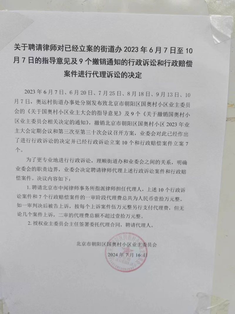 2023年6月7日、6月20日、7月25日、8月18日、9月13日、10月7日,奥运村街道办事处分别发布致北京市朝阳区国奥村小区业主委员会的《关于国奥村小区业主大会的指导意见》及9个《关于撤销国奥村小区业主委员会相关决定的通知》,撤销北京市朝阳区国奥村小区2023年业主大会定期会议和第三次至第三十次会议召开方案,业委会对此已经作出了进行行政诉讼的决定并已经行政诉讼立案10个和行政赔偿案件立案7个。