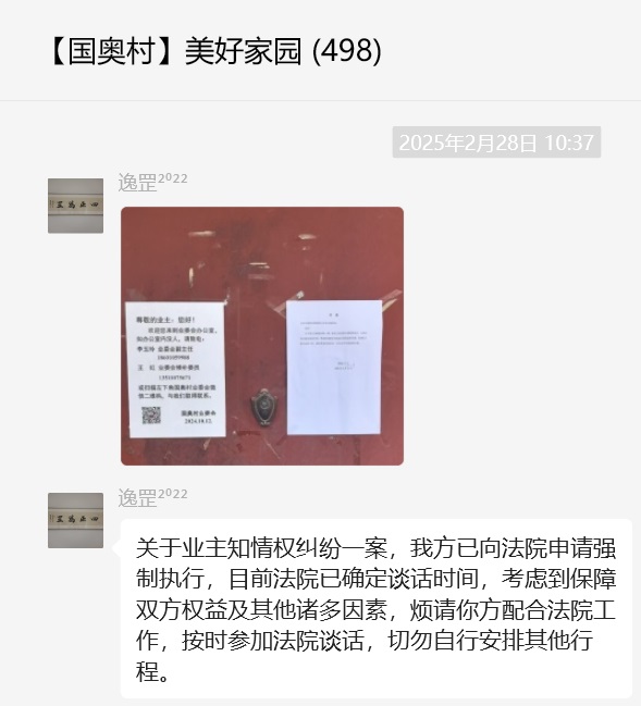 诉讼 2025年02月27日关于业主知情权纠纷一案,我方已向法院申请强制执行 Posted March 5, 2025March 5, 2025 jinrui 关于业主知情权纠纷一案,我方已向法院申请强制执行,目前法院已确定谈话时间,考虑到保障双方权益及其他诸多因素,烦请你方配合法院工作,按时参加法院谈话,切勿自行安排其他行程
