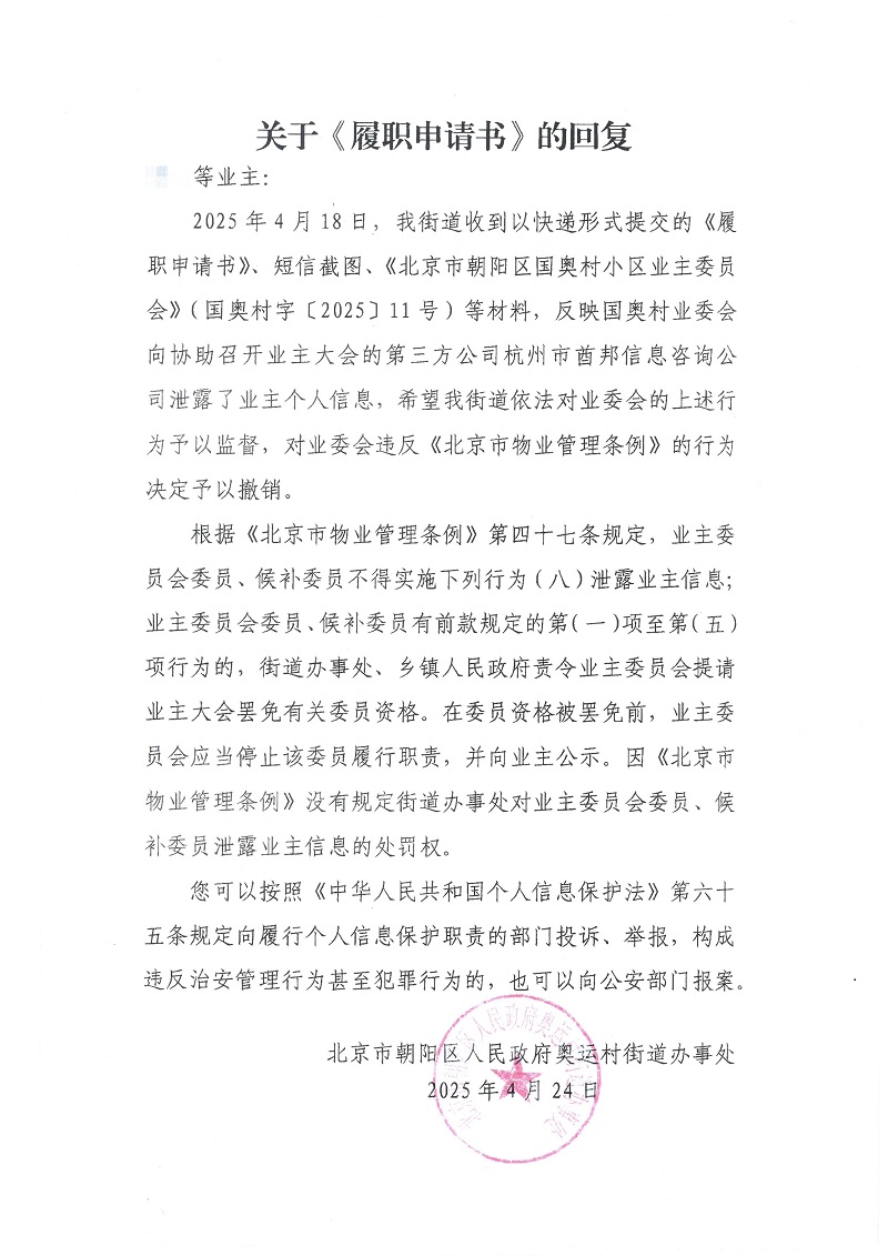 2025年4月18日,我街道收到以快递形式提交的《履职申请书》、短信截图、《北京市朝阳区国奥村小区业主委员会》(国奥村字〔2025〕11号)等材料,反映国奥村业委会向协助召开业主大会的第三方公司杭州市酋邦信息咨询公司泄露了业主个人信息,希望我街道依法对业委会的上述行为予以监督,对业委会违反《北京市物业管理条例》的行为决定予以撤销。