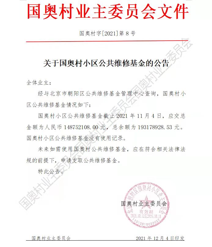 关于国奥村小区公共维修基金的公告