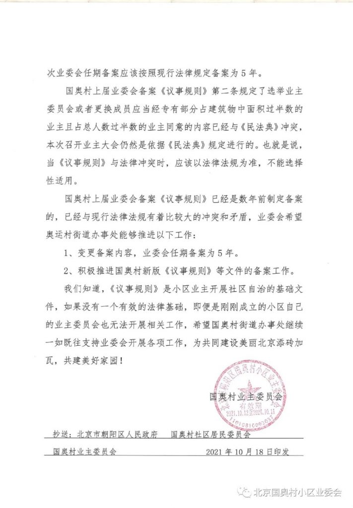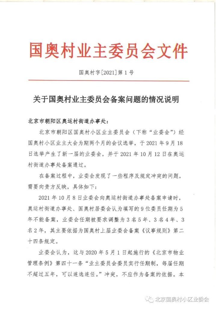 国奥村字[2021]第01号 (致奥运村街道办-关于业委员会备案问题)